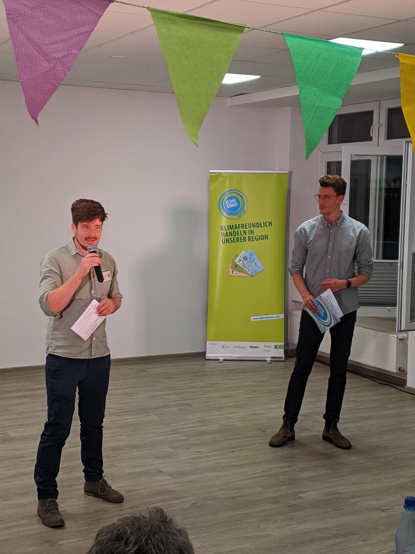 Interaktiv wurde es beim Basteln des persönlichen CO₂-Fußabdrucks. Dabei tauschten sich die Teilnehmenden über Ernährung, Konsum, Mobilität und Wohnen aus. Das Klimabonus-Team, vertreten durch Thomas Hermann und Franziska Bender, gab zudem alltagstaugliche Tipps zur CO₂-Vermeidung und stellte das Prinzip des Klimabonus vor: Wer Emissionen reduziert, erhält dafür eine Belohnung in Form von Klimabonus-Scheinen – einer regionalen Währung, die bei teilnehmenden Geschäften und Dienstleistern eingelöst werden kann.