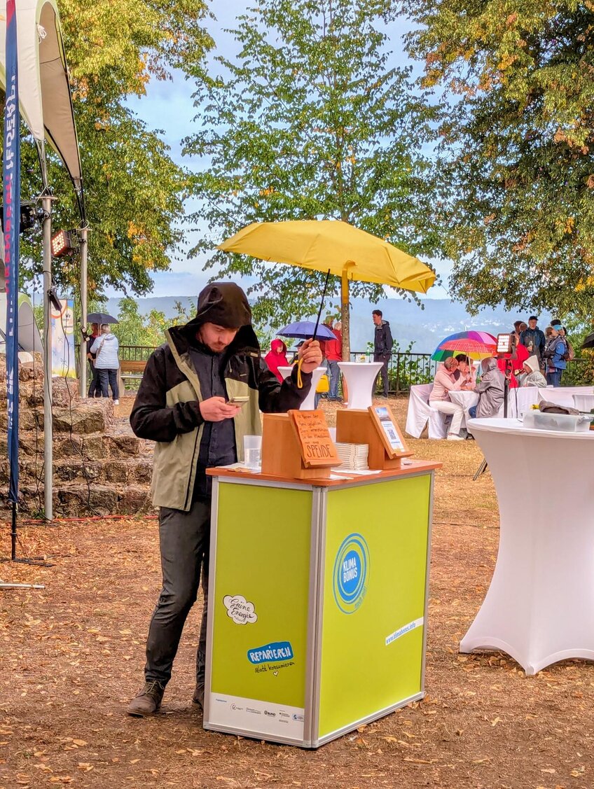 Ein kreatives Element bot das Basteln des persönlichen CO₂-Fußabdrucks – ein greifbarer Einstieg in Gespräche über Ernährung, Konsum, Mobilität und Wohnen. Ergänzend gab das Team des Klimabonus – Thomas Hermann, Simone Postigo Perez und Franziska Bender – praxisnahe Tipps zur CO₂-Vermeidung und stellte das Konzept vor: Wer Emissionen reduziert, etwa durch den Kauf eines Balkonkraftwerks, eines Pedelecs oder durch Reparaturen im Haushalt, wird mit Klimabonus-Scheinen belohnt. Diese entsprechen einem Euro und können in teilnehmenden Geschäften und bei regionalen Dienstleistern eingelöst werden. Damit verbindet das Projekt Klimaschutz mit der Stärkung der lokalen Wirtschaft.