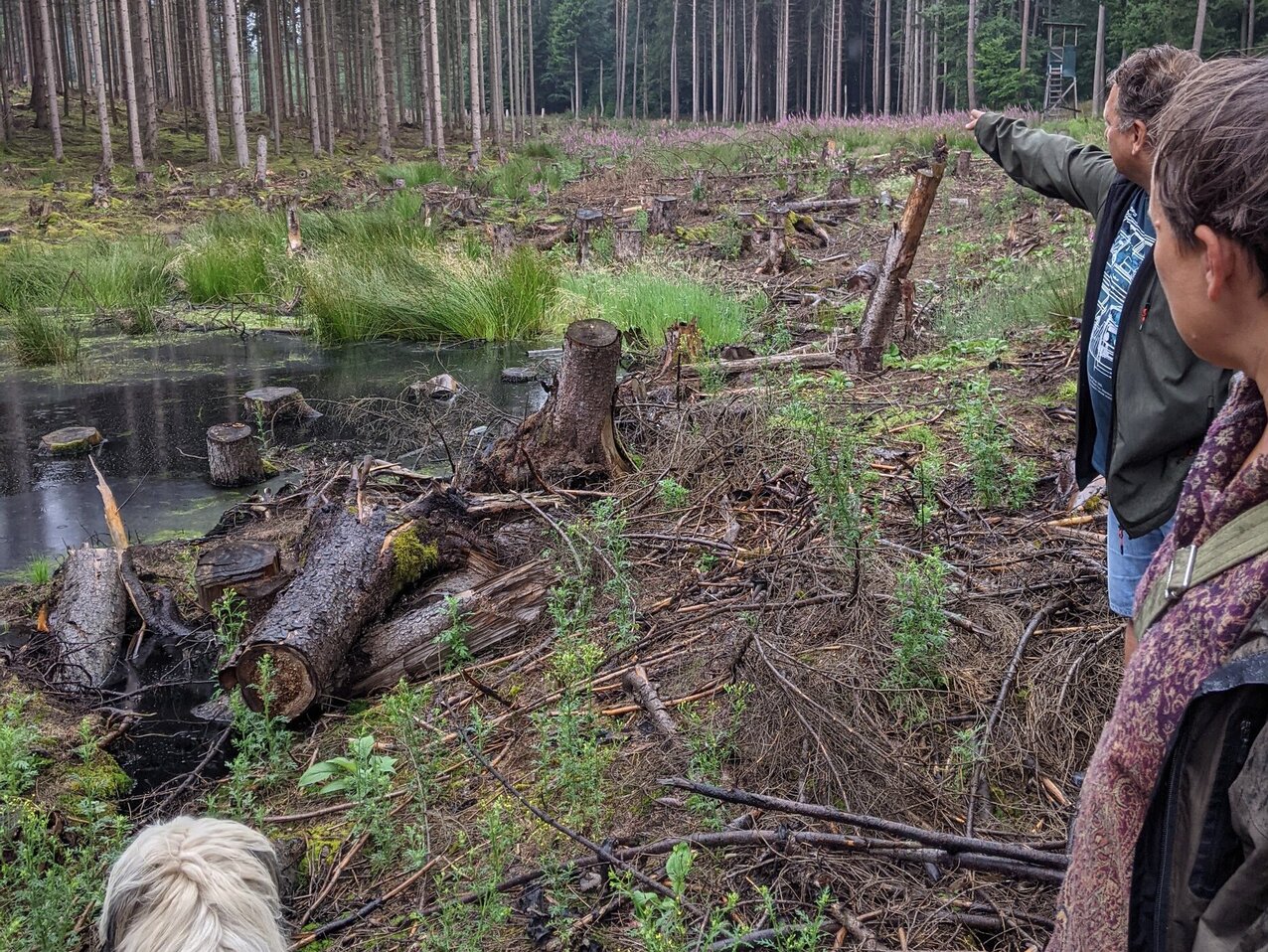 Abschließend besichtigte das Klimabonusteam am Sonntag, unter Anleitung von Jörg Näther von der Stadt Frankenberg, das Kompensationsprojekt „Brachter Kälberteiche" im Burgwald. Die Maßnahmen zur Renaturierung des Moors konnten vom Klimabonus durch die Kompensationszahlungen der Stadt Frankenberg aus der Europeade 2019 betreut und umgesetzt werden. Zukünftig wird eine Infotafel auf die Besonderheiten und Hintergründe des Moores verweisen.