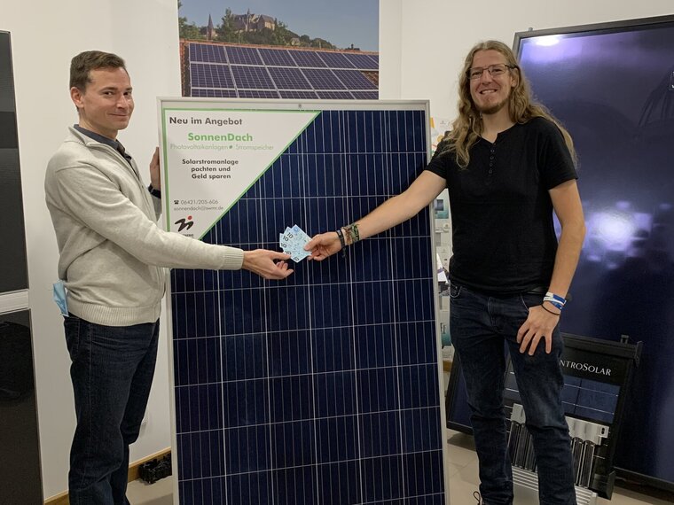 Mit den Stadtwerken Marburg konnte der Klimabonus einen wichtigen Partner zur Förderung des regionalen Klimaschutzes gewinnen. Das Angebot SonnenDach der Stadtwerke Marburg richtet sich an Hausbesitzer*innen. Das Prinzip ist denkbar einfach: Man stellt den Stadtwerken für die Installation einer Photovoltaik-Anlage die eigene Dachfläche zur Verfügung und pachtet die Anlage von den Stadtwerken, wodurch eine monatliche Gebühr fällig wird. Die Größe der Photovoltaik-Anlage kann ab 3 kWp (Kilowattpeak) bis über 16 kWp Leistung betragen, die monatlichen Gebühren variieren dann je nach Anlagengröße zwischen 52,50 und 173,00 €. Im Gegenzug produzieren Hausbesitzer*innen ab sofort ihren eigenen Ökostrom direkt vom Dach, den Sie (oder ggf. ihre Mieter*innen) entweder selbst nutzen oder ins Stromnetz einspeisen können. Die Kosten für Installation, Wartung und Reparaturen der Photovoltaik-Anlage übernehmen die Stadtwerke Marburg. Zusätzliche Stromkosten fallen nur dann an, wenn mehr verbraucht wird, als die Anlage zum Zeitpunkt bereitstellt. Die Pachtvergütung ist für 20 Jahre festgelegt, der Energiepreis für den Stromzukauf kann sich verändern. Um ein Gefühl dafür zu bekommen, wie viel man für seine monatliche Gebühr bekommt, sei ein kurzes Beispiel genannt für ein Einfamilienhaus. Für eine 6-Kilowattpeak-Anlage werden monatlich 67,20 € fällig, also 806,40 € jährlich, dafür liefert eine solche Anlage in Hessen etwa 6000 kWh echten Ökostrom jährlich. Etwa ein Drittel der selbstproduzierten Energie können direkt verbraucht werden. Der Strombedarf einer vierköpfigen Familie beträgt etwa 4000 kWh pro Jahr, diese Energiemenge kostet bei den Stadtwerken Marburg etwa 1342 €. Durch Stromzukauf (dann wenn die Sonne nicht scheint) und den Verkauf von Stromüberschüssen lassen sich mit dem SonnenDach der Stadtwerke Marburg in diesem Rechenbeispiel bis zu 130 € einsparen, und das jedes Jahr.