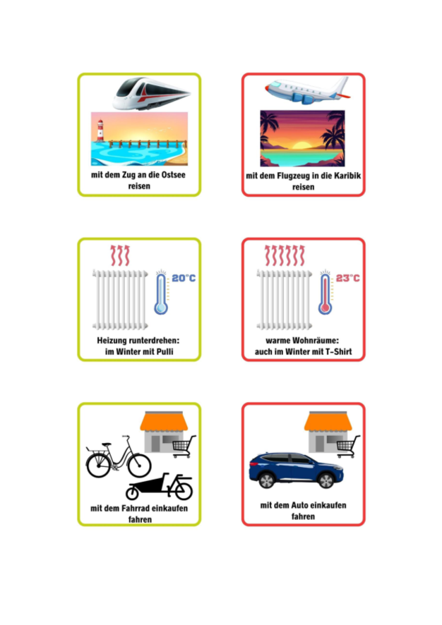 Dabei handelt es sich um ein „unechtes“ Memoryspiel, dessen Kartenpaare NICHT dasselbe Bild abgedruckt haben. Vielmehr suchst du nach einer klimafreundlichen (grüne Umrandung) und klimaschädlichen (rote Umrandung) Sache/Verhaltensweise, die zu dem jeweiligen Thema passt. Die Beispiele sind stark verallgemeinert.