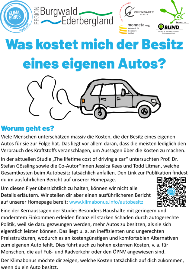 Hier kannst du sowohl unseren Infoflyer (8 Seiten) zu den Kosten des Autobesitzes als auch unseren Postkarten-Flyer (2 Seiten) herunterladen.