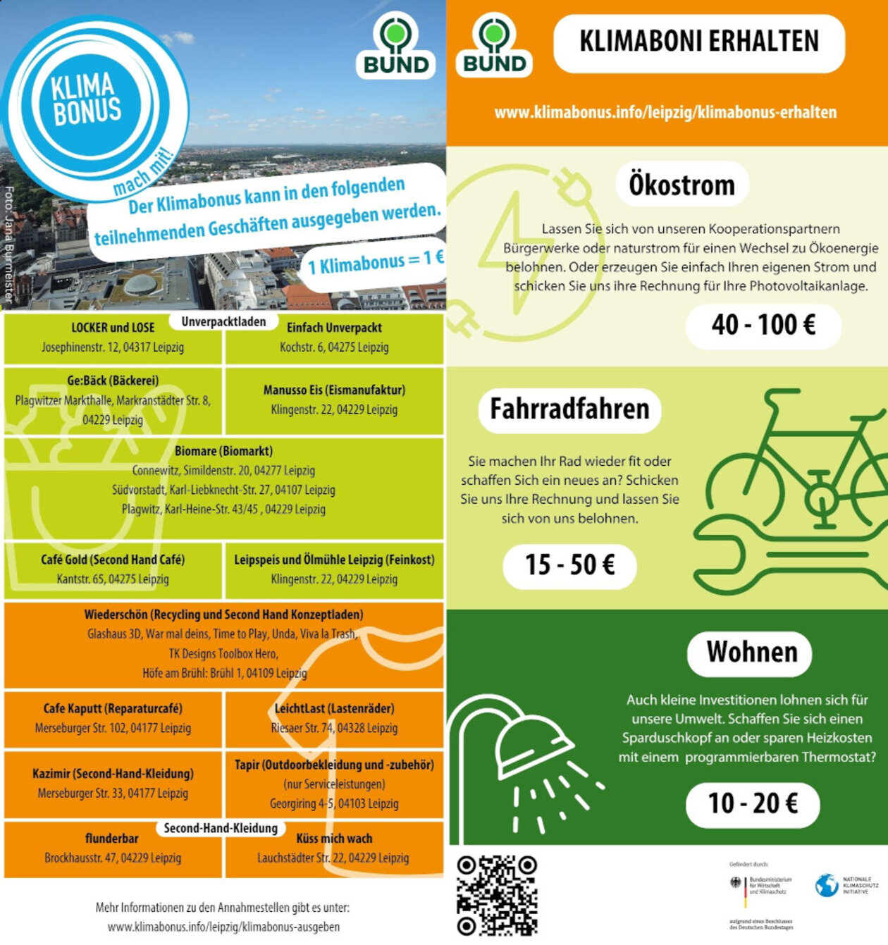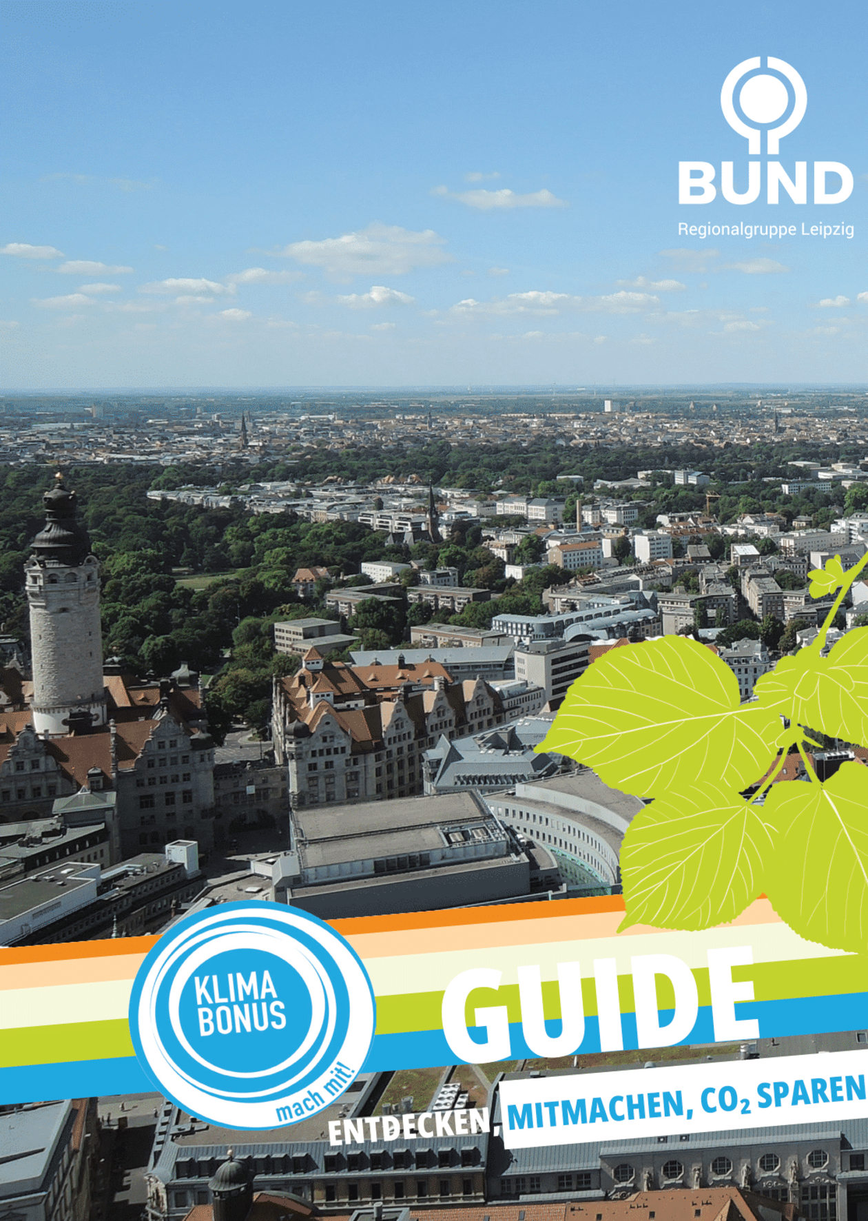 Der Klimabonus Guide gibt viele Tipps zum Klimaschutz und zeigt euch das Klimabonus Projekt in der Region Leipzig. Der Guide ist voraussichtlich ab dem 16.5. bei allen teilnehmenden Partner*innen des Klimabonus kostenlos erhältlich und wird außerdem in der Geschäftsstelle der Region Leipzig im Haus der Demokratie ausgegeben.