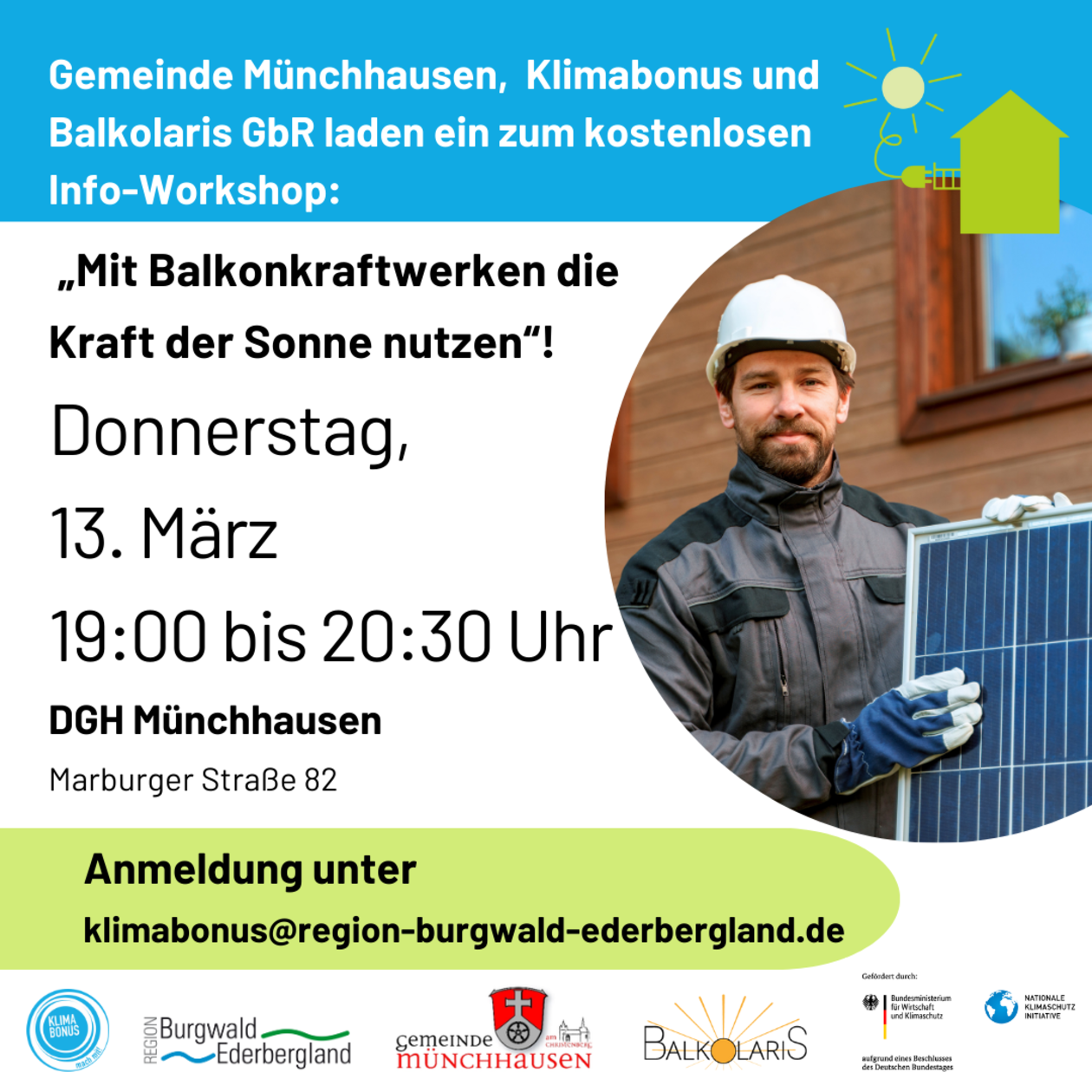 Die Teilnahme an der Veranstaltung ist kostenlos. Vor Ort können keine Mini-PV-Anlagen erworben werden. Der Klimabonus belohnt den Kauf einer Anlage mit 100 Klimaboni (=100€), die bei den Annahmestellen in der Region ausgegeben werden können! Die Belohnung kann über das Formular auf der Website beantragt werden.